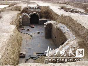 考古专家介绍说,天玺元年应当是公元276年,属东吴晚期,末帝孙皓为维护其统治,曾制造了“天命永归大吴”的舆论,但天玺只存在了一年。这座大墓坐北朝南,背靠山坡,长达9米,宽3米。墓门甬道前排水沟长约5米多,甬道后分前室和后室,“一厅两室”有通道相连。内铺地砖,地砖也满是钱纹图案,都作人字纹铺砌,墙体为“三顺一丁”的砌法。“四隅券进式”穹降顶,左右两侧各用两层砖垒砌祭台。在大墓的西侧还发掘出一座同时代的小墓,专家认为,从墓型的规模和出土来判断,这应当是家族墓群,墓主身份等级非常高。