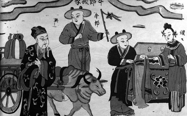 这是宋朝的秦观以七夕节为题材创作的一首名为《鹊桥仙》的词。七夕节又名“乞巧节”,是中国传统节日中最具浪漫色彩的。七夕节的主人公,一个牛郎、一个织女,都是农耕社会的形象。牛郎、织女的神话传说起源很早,大概与古人对星辰的崇拜有关。牛郎和织女,在我国很早就被称为“双星”。位于天河西面由六颗星组成的牛宿星,分布形状看上去像牛的轮廓;东面是织女星,在它的东南方还分布有像一部织布机形状的四颗星。两个星座相对,像一对恋人含情脉脉,遥相凝望。到每年农历的七月初,两星的距离在人们视觉上最近。这种神秘的天象,激发了民间创作的想象,由此引发出了美丽的爱情故事。《诗经·大东》中最早记录了牛郎、织女的情事: