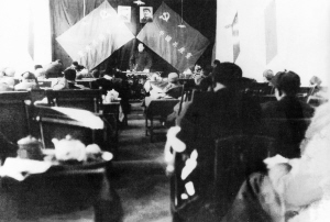 关于当年会场的布置还有这样一段故事:会场是由中央招待所所长陈心良等布置的,最初悬挂的是毛主席和朱总司令的照片。1949年3月5日那天,毛主席到会场一看便提出批评:开会不要挂我们的像,这样不好,应该挂马、恩、列、斯的照片。第二天就挂上了四位国际伟人像,可大家议论纷纷,你一言,我一语,说法不一,就又将毛主席和朱总司令的像挂在两旁,结果再次受到毛主席的严厉批评。