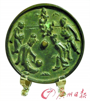 而最有亲和力和有趣的当属商承祚先生亲属捐赠文物7件(套)之蹴鞠纹镜。记者在现场看到,这面铜镜的背面雕刻着4名梳着高髻的男子身着长袖阔腿裤,在花园里踢蹴鞠,有一人控球,双方对峙,有攻有守。据介绍,蹴鞠流传了两千三百多年,它起源于春秋战国时期的齐国故都临淄,唐宋时期最为繁荣。(记者鲍文娟)