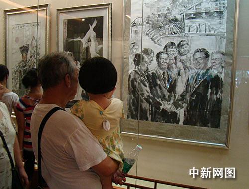 记者看到,“蜀派”画风代表人物李江、周平、李风彬创作的《川东旧事》、《红色家园》、《凉山之秋》等画作均得到观众一致好评。最引人注目的还是挂于大厅正中的《1949年成都市民欢迎解放军入城》以及《胡锦涛总书记视察农科村》两幅作品。四川四海画院院长李任仕告诉记者:“本次一共展出了60余幅作品,包括胡锦涛总书记视察郫县农科村、‘5.12’抗震救灾、灾后灾区人民安居乐业、羌笛重奏等场面,以及巴山蜀水的新貌丽容,都用心纳入笔墨之中,画出了今日天府诗意盎然的锦绣风光,呈现了一个时代的沧桑巨变,其风采神韵,灿烂多姿,让人如入胜境,如沐春风,深切感受到巴蜀山川竞秀,人民幸福安康。”