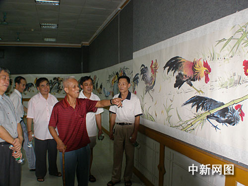 《百鸡图》由年近八旬的中国书画协会会员谭飞彬老先生创作,2008年春开笔,今年8月底完成。该图长40米,宽1点2米,画有180只鸡。