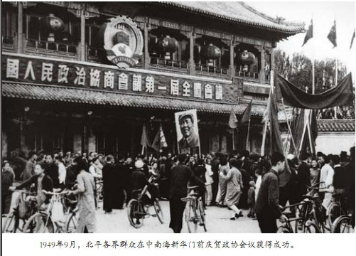 1949年9月21日晚,中国人民政治协商会议第一届全体会议在中南海怀仁堂隆重开幕。出席开幕式的包括各党派、团体代表634人和来宾300人。当毛泽东以沉稳、缓慢的语调庄严宣告“我们的工作将写在人类的历史上……我们的民族将再也不是一个被人侮辱的民族了,我们已经站起来了”时,会场里,所有人的眼里都闪烁着泪花。