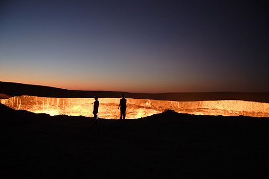 图片中这个深不见底的大洞被当地人称为“地狱之门”,位于乌兹别克斯坦一个叫做达尔瓦兹的小镇附近。