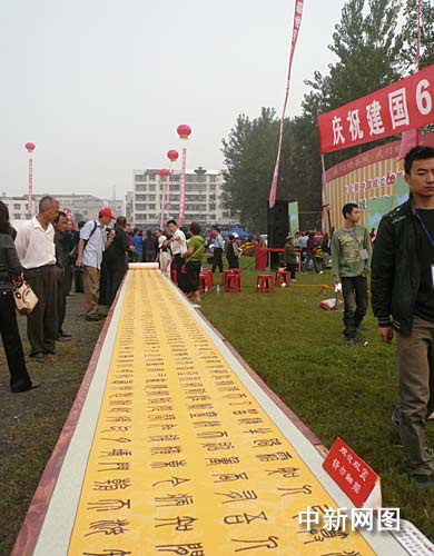 中新社襄樊9月29日电 (涂玉国)长一百一十米、宽零点八米,用五种字体书写的毛主席诗词的书法长卷,二十九日在湖北省襄樊市谷城县博览会上现身。这是该县文化馆副馆长、书法美术家协会主席许祥强为庆祝新中国成立六十周年而作。