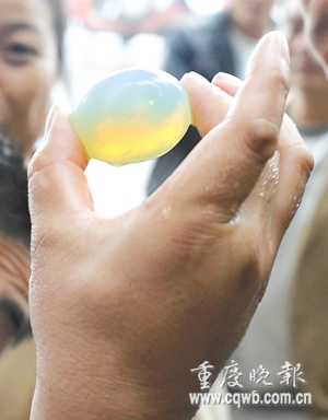 现在,长江江津区白沙沱渡船码头水域沿岸,携小铲在鹅卵石中寻找或挖坑者每天都有二三十人。原来,他们是受了刺激:数年前,当地一艘采砂船老板陈增刚偶然得到一砣类似鸡蛋的怪石,后来包裹怪石的钙化疙瘩脱落后,石头不仅通体透明还散发出类似晚霞的光亮,文物专家鉴定为罕见玛瑙。