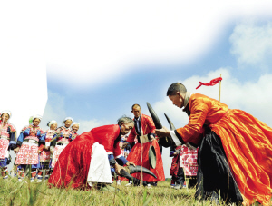 金秋时节,龙里县草原乡中排村苗族同胞举办了一场别开生面的“人斗牛角”比赛。很多城里人都是第一次见过。帅帅的斗牛士,打扮得很精神,身穿大红袍,扭动着腰肢和屁股,双手手拿长长的黑牛角,在空旷的草地上相互招摇挑逗。斗牛士机智的躲开,甚至显示自己水平高超,双膝跪地,再挑逗,牛角再顶,斗牛士再躲……
