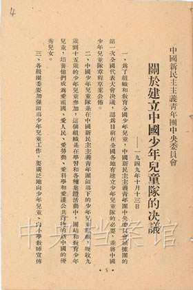 新中国成立后,1949年 1O月 13日,中国新民主主义青年团中央作出《关于建立中国少年儿童队的决议》,决定将少年先锋队和儿童团合组为少年儿童队,以便更广泛地团结和组织少年儿童。《决议》指出,中国少年儿童队是中国新民主主义青年团领导下的少年儿童组织。它的任务是在学习和各种集体活动中,团结和教育少年儿童,培养他们成为具有丰富的科学文化知识,健全体魄与爱祖国、爱人民、爱劳动、爱科学和爱护公共财物的新中国的优秀儿女。 1953年 8月21日,团中央决定将 “中国少年儿童队 ”改名为“中国少年先锋队 ”,简称少先队,并说明:改名后 “没有改变其性质和任务, ‘中国少年先锋队’仍然是广泛性的少年儿童自己的组织”。