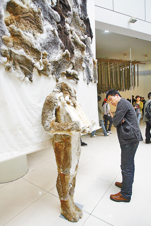 昨日,由英国柯罗默中国当代艺术基金会和四川美术学院共同设立的“柯罗默中国当代艺术优秀者奖学金”颁奖仪式暨获奖作品展在重庆美术馆拉开帷幕,25幅入围作品在美术馆进行了展出。其中,来自中央美术学院雕塑系徐永杰的作品《三元论的圈套》用100张兔毛诠释 80后的性格。“其实80后人群看上去很华丽,但内心却充满不安感,所以我用兔子毛将人包裹起来。”