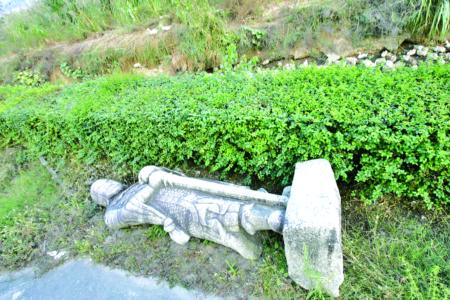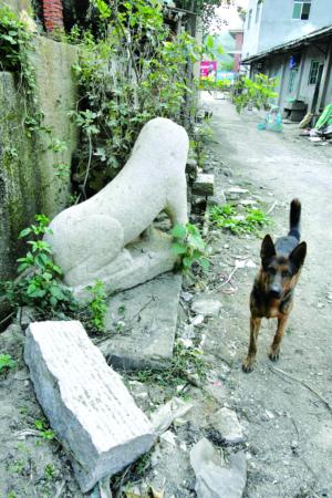 据了解,在古代,三品以上官员(包括三品)的墓道上才能放置石翁仲。那么,这些文官武将在守护谁,古墓又在哪呢?记者开始在石像周围寻找有关古墓的蛛丝马迹,在石像一墙之隔的工厂内,记者找到一尊被敲掉脸的石虎。按理,石虎一般和石羊、石马、石翁仲共同放在墓道上,成对出现,可如今只有一只,那么其他的石像又在哪里呢?此外,记者还在石像附近的起步岭古道台阶旁找到一根柱子,柱子正反面都雕刻着楷书的对联,正面刻的是“三省千城蕴豹翰”,背面刻的是“一门诰命沾恩重”。
