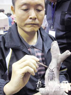 “这只天牛是真的还是假的呀?”南京技师学院一位女学生指着马志刚手里的作品问道。“是假的,我正在给它安装两只触角。”这位双腿残疾的无锡陶艺家笑答。46岁的马志刚告诉记者,他2岁时得了小儿麻痹,初中毕业后就没再上学,没找到工作只好自谋生计。白天开小三轮车送客挣钱,晚上就自学紫砂艺术,以自己的悟性涉猎陶艺制作。