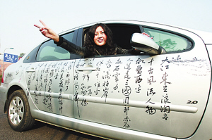 靓女开车?司空见惯,但要是靓女开着的是一辆“东坡词”小轿车,肯定是你没见过的。昨日,网友“一场美丽的邂逅”发帖称,好友是个美女,在其爱车的车身一边喷上水墨山水画,而在车身的另一边,更是喷上了北宋大家苏东坡的《念奴娇·赤壁怀古》词句,这样的车、这样的人,让网友们兴奋不已。