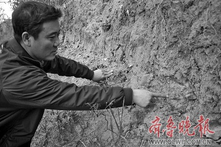 11月21日,跟着宫德杰,记者来到临朐县东上林村,从1米到3米不等高的河边台地断崖中,记者看到了不少北辛文化遗址。宫德杰说,遗址大多位于东上林村东南的河边台地上。遗址西南部断崖处暴露有文化层、灰坑、墓葬、壕沟、红烧土等遗迹遗物。由断崖观察,北辛文化层厚约0.5至2米不等。