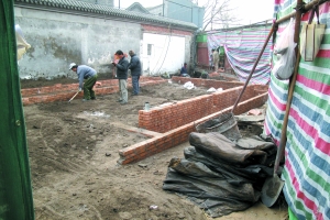 昨日,记者在旧址看不到拆下来的原材料,且建筑工人正在用新砖头堆砌造房。