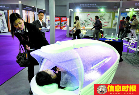 “这是家庭用的水疗美体太空舱,过去只在国外流行,现在是在中国很流行。”来自北京某医疗器械公司负责人沈丽娟说,中国人很讲求私密性,到美容院做美体水疗不如在家来得舒坦。这台家用式水疗美体太空舱集沐浴、水疗、按摩、干温蒸等功能于一体,内部还设红外线治疗、LED蓝光治疗等,而且可以一边做美体一边听音乐、睇电视。