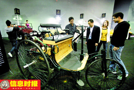 弹孔连珠式散布的毛泽东座驾,威风凛凛的周总理座驾红旗CA770,还有奔驰1号——人类汽车制造史上的第一辆汽车……本届奢侈品展人气最旺当属老爷车展区。今年,主办方花费过百万元搜罗、租赁20辆名人老爷车,以及孙中山、周恩来、朱德、彭德怀、慈禧、溥仪等人当年的座驾。