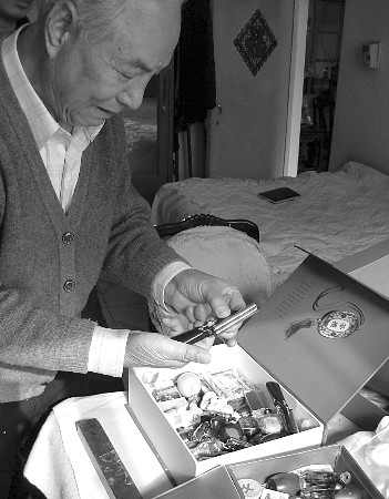 路老说,进入上世纪80年代后,他调入市政协工作,空闲时间多了,便利用闲暇时间开始了个人的爱好收藏,“先是练习书法,后来写点诗词,老伴则迷上了绘画,我们互相给对方评价,觉得好的就收藏起来,后来又拿到各种展览会进行展览,也曾经向报社投过稿,还获得了不少证书,这些来来往往的资料也都收藏起来了。” 后来,路老又收藏起古瓷器、陶器等古董和奇形怪状的打火机,刘老则喜欢上了根雕艺术,如今,二老的家中到处都摆满了二人收藏的物品。