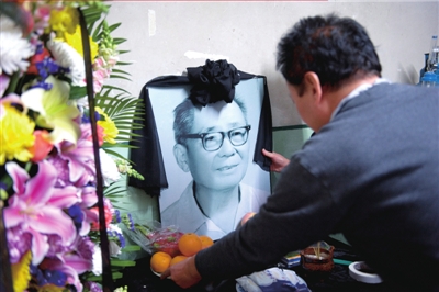 昨天在灵堂前,王秀荣用父亲生前最喜欢的口琴给老人吹奏《送情郎》。悠扬的口琴声响起时,老人的子女顿时哭声一片,“这节奏太熟悉了,我觉得我爸没走”,大女儿王秀英说。(记者于杰)