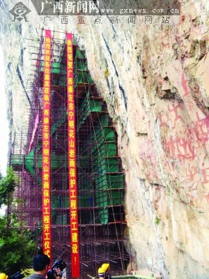 贴着这处高250米、宽200米的花山岩画,施工队已经在高30多米、宽近70米的范围内建起了钢筋脚手架,据广西区文化厅文物处一位工作人员介绍,针对这个脚手架也有专项研究和设计方案,搭建脚手架花费了近1年时间、200多万元经费。在现场察看了脚手架后,国家文物局副局长童明康肯定地说:“这个脚手架不错,修缮故宫用的脚手架也不过如此。