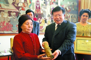捐赠仪式上,肖大娘将诰命交给国图副馆长张志清。