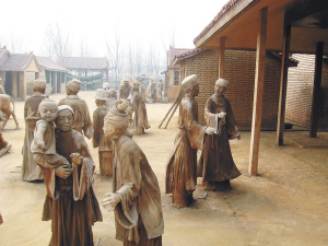 据他介绍,从完成画中每一个人与物的构思到成形,需要经过搭建钢筋骨架、堆泥、塑形、修饰、防雨防晒处理等几道工序。而在各式各样的作品中,人物的形象是最难把握的。“画中的人物男女老幼皆有,衣着形象不同,表情神态各异,传神之处关键在五官,尤其是眼和嘴。其次是手和服饰的质感,比如穿什么样的衣服,走路时会出现什么程度的衣褶;头巾、衣衫被风吹起部分的长短、薄厚都有讲究,一定要尽量贴切,才能给人以真实生动的感觉。因此在实际操作中,经常会出现对不满意的作品返工重做的事情,这样即便是速度最快的工人,做一个泥塑人物也要四天左右的时间。”