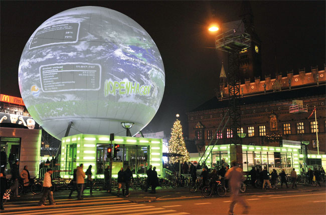 12 月7 日,记者抵达哥本哈根。据说,有大约1200 辆豪华汽车、140 架私人飞机以及数万人涌入哥本哈根,为此,丹麦政府不得不为会议购买价值60 万欧元的“碳积分”。中国和美国成为会场里最受关注的焦点。而在会场外,到处可见环保人士的环保秀,来自小岛国代表的示威抗议也此起彼伏。此时,受人瞩目的哥本哈根变成了一个环保“大秀场”。