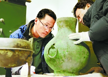 12月22日下午,沧州市文物局工作人员将刚刚在北京修复好的青铜器清点入库收藏。自2008年11月开始,国家文物局分三期对沧州市文物局的近400件破损青铜器文物进行修复。目前已有126件“破镜重圆”,重新入库收藏。 (贾恒 摄)