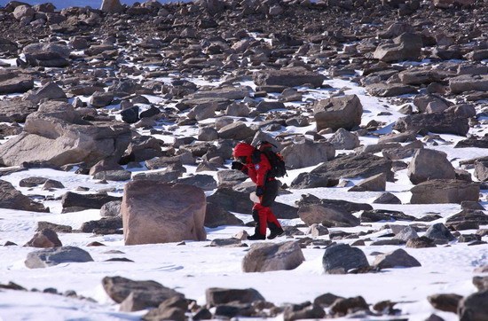 当地时间12月30日16时(北京时间12月30日19时),中国第26次南极考察格罗夫山队在格罗夫山地区的最高峰——梅森峰脚下发现一块陨石,这是考察队在此次考察活动中发现的首块陨石。从陨石的破裂面可以初步判断这块重221.5克的陨石为普通球粒陨石。新华社记者崔静摄