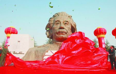 沉思的表情,深邃的双眸,1月1日,“成功之路”——巨型爱因斯坦头像雕塑在郑州高新区科学大道揭开“大红盖头”,寓意科学大道将成为“成功之路”。