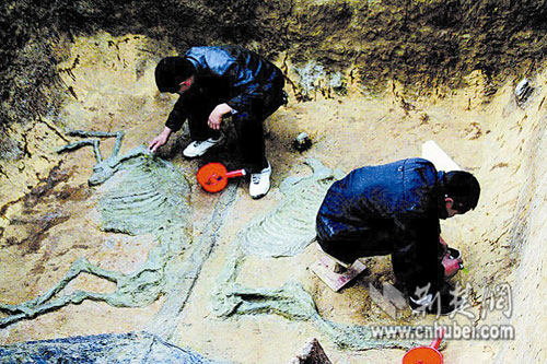 熊家冢距荆州城45公里,地处川店镇宗北村与张场村。从1979年起,荆州文物部门对该墓进行了3次大规模的勘查,初步探明,它由主冢、陪冢、车马坑、排葬坑、壕沟5部分组成。2006年8月开始,考古人员已经对车马坑及部分排葬坑进行抢救性发掘。主冢西侧的一座长131.1米的车马坑,是迄今发现的最长的战国时期车马坑,其中出土马车43乘,马164匹,出土各类器物2000余件套。发现三乘“一车六马”马车。从墓地规格推测,墓主人很可能是一位楚王。(见习记者罗茜 通讯员杜玉辉)