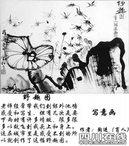 “老师经常带我们到郊外池塘感受和写生,有几次是要下雨时有许多蜻蜓飞到我头上和身上,这在城市里是感受不到的,所以我就创作了这幅野趣图。”作者陶进的写意画《野趣图》在网上流传开后,引起了太多人的关注。类似齐白石的创作手法,笔墨凝练精致,让蜻蜓鲜活地跃然纸上。让人意外的是,作者在介绍自己作品时附上了“盲人”二字。这些美丽、充满希望和激情的画卷,真的出自盲人之手么?那么又是谁教的呢?记者随后联系到盲人画家陶进,他介绍了这门特殊艺术的缔造者、曾任广西南宁市残联副理事长的曾柏良。曾柏良目前已培养了近20位盲人画家,造就了世界上第一批盲人绘画团队。