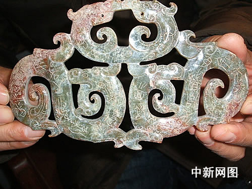 玉佩共有两块,每块长十七厘米,宽十厘米。每块玉佩分别有四条龙组成,玉佩顶部两条龙的嘴部,分别有两个细小的孔眼。通过放大镜可以看出,孔眼的两边呈大小喇叭状,孔圆形状不规则,明显是手工作品。从玉佩表面的图案上也可以看到,图案为游丝毛雕工艺。根据历史资料记载,此工艺出现在战汉时期,并早已失传。更为珍贵的是,此玉为沁玉,收藏界有“古玉三分沁,赛过十两金”之说,因此,这种沁玉需在地下埋藏几百年甚至数千年后才会形成,现代工艺根本无法仿制。