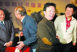在昨天的仪式上,北京人艺现场播放了由十位剧作家创作的每一部曾在北京人艺上演的话剧的精彩片段。北京人艺院长张和平亲自为每位剧作家颁发了“北京人艺荣誉编剧”证书,并充满感情地表示:“剧之本乃院之本,剧院与剧作家的关系是水和鱼,是手心和手背。”张院长说,北京人艺从建院之初就把团结剧作家放在了首要位置,一个剧院,能在建院初期就拥有郭沫若、老舍、曹禺这样三位剧作大家连续为自己提供剧本,从而打造出北京人艺在话剧界的光荣。可贵的是,北京人艺在几十年间结交了一大批剧作家朋友,而在座的你们是其中的翘楚。你们的剧作绚丽过首都剧场的舞台,你们的智慧滋养过北京人艺的血脉。你们是一出剧目的始作俑者,更是一个剧院的砥砺中坚!”