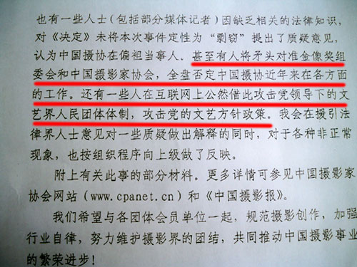 怎么可以使用思想如此陈旧的秘书,来起草这样陈腐的、充满“阶级斗争火药味儿”的协会文件?而且,明明是因为自己的失察,造成可能在世界摄影史上也不多见的所谓多人联合创造照片并且荣获“金像奖” 的怪异典型,却还在责备别人:“将矛头对准金像奖组委会和中国摄影家协会,全盘否定中国摄协近年来在各方面的工作。还有一些人在互联网上公然借机攻击党领导下的文艺界人民团体体制,攻击党的文艺方针政策。”