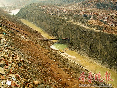 记者20日来到发现古墓的工地。因为下雨,工地中一片泥泞。这个刚被挖出的宋元古墓在一条东西走向的河沟沟底,距离地面约五六米,墓口用两根棍子示意。起初,墓穴的外形还比较明显,随着河沟一侧的雨水向墓穴汇去,几十分钟的工夫便被淹没了。