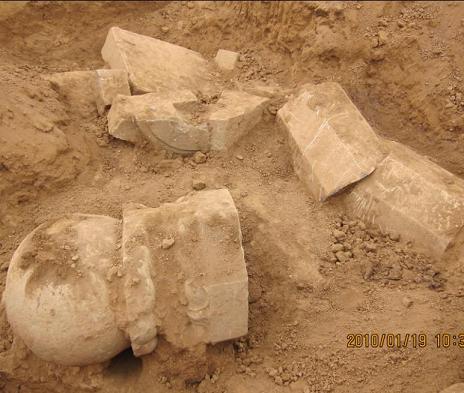 中新网1月21日电 据国家文物局网站报道,近日,陕西省蒲城县文物局文保中心在进行景陵南门石刻扶正及基础加固工程时,沿南门神道原西侧华表遗址处,勘探发现了倒覆于地下的华表。