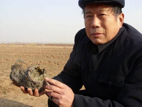 据介绍,今年1月19日,肥乡县中油胡寨村的一位村民在村东田间拉玉米秸秆时,突然看见一道火光从天而降,落在身旁几十米远的地方,地上被砸出了几个坑,坑的直径约30厘米,坑周围的泥土和麦苗全被烧焦了。看到这个奇异的景象后,他赶紧跑回村叫来几位村民,拿着铁锹在火光落地点周围2米的范围内挖寻,找到了20多块形状不规则的“石头”。随后肥乡县科技局和气象部门的相关工作人员赶到现场对这些不明物体进行勘察,初步鉴定这些不明物体很可能是“ 玻璃陨石”。