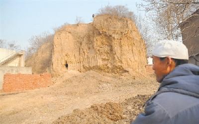 昨日10时,记者从二七区马寨镇向西,不到一公里就到了荥阳贾峪镇的马沟村。进入村子,该村的大人孩子听到问樊哙墓,都知道这个地方,“是不是俺村北边的那个大土堆?”说着,几位村民就把记者领到村北。虽然有民房挡着,但远远还能看到高出二层楼的一个巨大土堆。村民刘先生带着记者赶到这个大冢前,冢顶荆条丛生,冢的南半部有被挖掘机开挖的痕迹,不少土被移走,冢南侧成了高约7米的直立的壁崖,而壁正中间却有一个洞口,黑黑的通到冢子里面去了。“这个是盗墓的人挖的洞,应该是解放前有人在这里盗挖的,挖过后他们把口封上了。前不久,村里挖掘机来取土填坑,突然看到这个盗洞,有大胆村民用梯子爬到洞口,向里爬了几米后,里面渐渐小了,还有怪气和砖,就不敢进去了。”刘先生说。