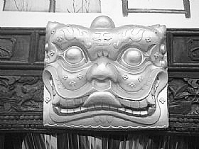 它是绘有狰狞怪兽的器物。怪兽绘太极八卦图,豹眼怒视,龇牙咧嘴,犬齿突出,血口洞开,好似能吞掉一切灾祸和妖魔鬼怪,保佑风调雨顺,避邪救灾。怪兽的形象或烧制成瓦当用作屋檐口,或雕刻于石柱立在道旁,或彩绘于木瓢背面悬挂于门楣之上。市内某些地方,也有请巫师(或称道士)手绘于纸的吞口(口中横含短剑),挂在门楣上边。