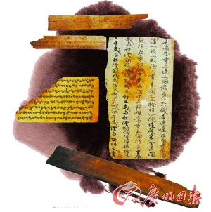 在语言文字展品中,有一块“佉卢文木牍”,这也是中国最古老的信封——文字写在木牍上,用绳子封起来。由于西域天气干燥,木牍保持完好,文字依稀可见。但目前这封信上的内容尚未破译。