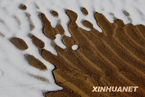 庚寅初春,大雪之后罗布泊地区沙漠厚厚的积雪渐渐融化,在沙地留下斑痕,形成融雪趣景(2月18日摄)。去冬今春,新疆沙漠地区普降罕见大雪,为“干渴”的大漠带来雨水的滋润。新华社记者汪永基摄