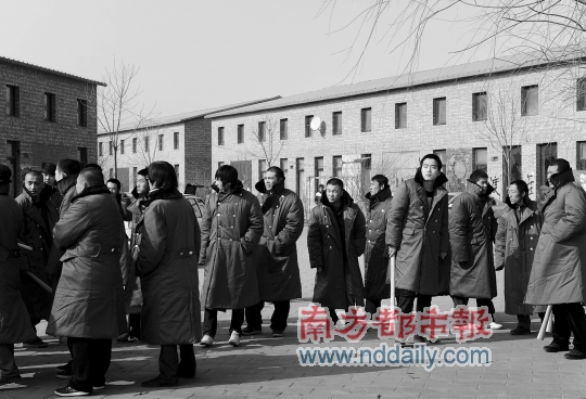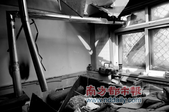 2月23日,正阳艺术区值班的艺术家们,只得围坐在炭火边取暖。自2009年11月起,艺术家们原先租住的房屋已经被断水断电,而前一天,原先可生炉子居住的维权办公室,已被不明身份的人士用大型机械掀去屋顶,房门及窗户等均被砸烂。