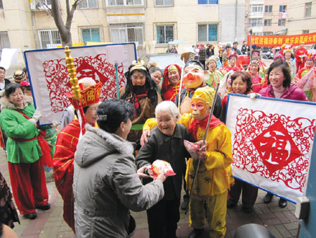 昨天上午,万全社区欢乐杂耍队的队员在社区书记王淑贞的带领下穿梭于辖区19个楼院中,他们一路耍起来、扭起来,并且把祝福送到居民家中。特别给社区的省劳模、党员金星和孤寡老人送去了香甜的元宵。