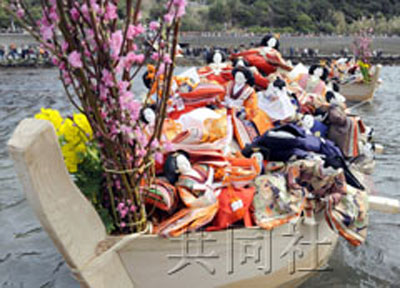 “共同社”消息,当天,约8千名参拜者目送几艘小船载着约600个人偶渐行渐远。3只白木小船上放满了女儿节人偶,寄托着人们的各种心情,诸如祝愿女儿安产或者是祝贺孙女婚嫁。当天在温暖的阳光照耀下,一些女性挑着小船将它们运到海边,然后放入海里,让海水将它们冲走。该神社在过去一年从全国各地收到共约5万个人偶。