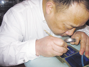 王志伟说,他是子承父业,他可以在一个直径8毫米的珍珠上刻100多字。他的父亲是常州著名工艺美术大师王清源,父亲可以在米粒般大小的珍珠上刻下一首完整的百字左右的毛主席的词——《沁园春·雪》。父亲曾任常州工艺美术研究所副所长,今年已经77岁的高龄,还在继续创作。