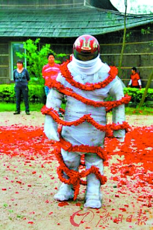 3万响大红鞭炮裹在身体上轰然炸响——第三届前提艺术节3月6日在清远牛鱼嘴园区正式开幕,由艺术家文皆实施的这一“行为艺术”作品,以分贝的巨大和视觉效果的突出,成为开幕现场众多诡异的“艺术作品”中最具关注度的之一。