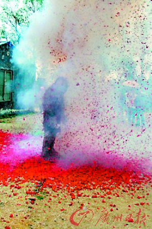 “人肉炸药”行为艺术?3万响鞭炮覆满全身(图)(2)——中新网