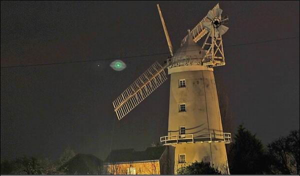 据英国《太阳报》10日报道,一名摄影师无意间拍到英国东部城市诺福克一座风车上空的一个神秘物体。