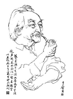 在与张老的交往中,看到他有个习惯与形象,那就是拿烟斗抽烟,左手环胸,右手举着烟斗抽烟,神定气闲,十足的绅士派头。1996年6月8日,我去张老家里为他画像,截取的就是张老的这个招牌形象。记得当时我告诉他说,我准备画他拿烟斗抽烟的形象,他立即摆出我想要的姿势,让我从从容容作画。画好之后,他欣然题词:"艺术源于生活又高于生活,延声同志为余作小像,书数字以互勉,丙子年夏,它山张仃"。