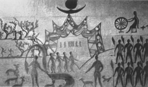 舜在中国历史上颇有盛名,而歌颂他的乐舞《大韶》也同样有名。传说夏启有一次去天上做客,顺便把天宫的乐舞《九歌》默记在心。回到人间后,他就叫人在大穆之野演出了《九韶》。演出者们“击石拊石”,其演出场面“凤凰来仪,百兽率舞”。